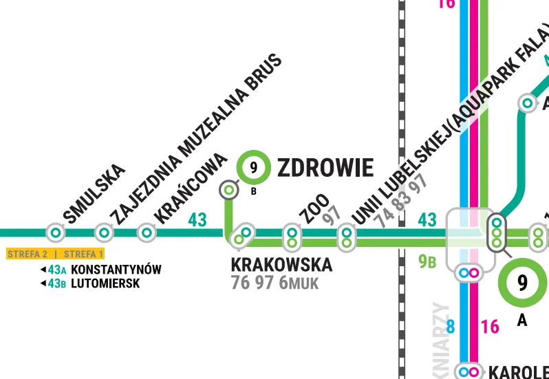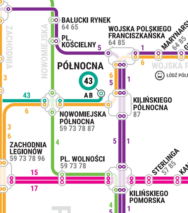 Odchodząc od skrzyżowania al. Kościuszki z Zieloną, tramwajem nie pojedziemy także przez ul. Gdańską, pl. Wolności, częściowo Pomorską, Wojska Polskiego, Strykowską, Warszawską, częściowo Kilińskiego i po ul. Niższej.