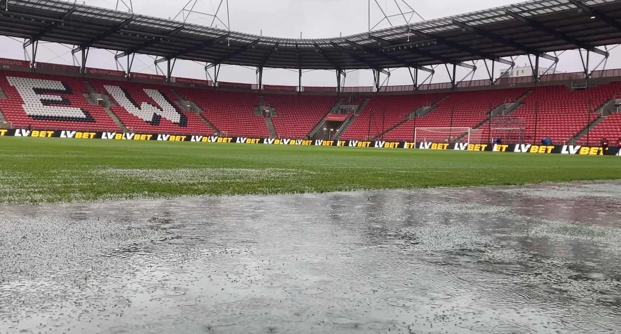 Z nagrania opublikowanego przez drużynę widzimy zalaną murawę, na której zaczęły tworzyć się spore kałuże. Dla kibiców może to oznaczać, że dzisiejszy mecz, który powinien rozpocząć się o godzinie 15:00 może zostać przeniesiony na inny termin.