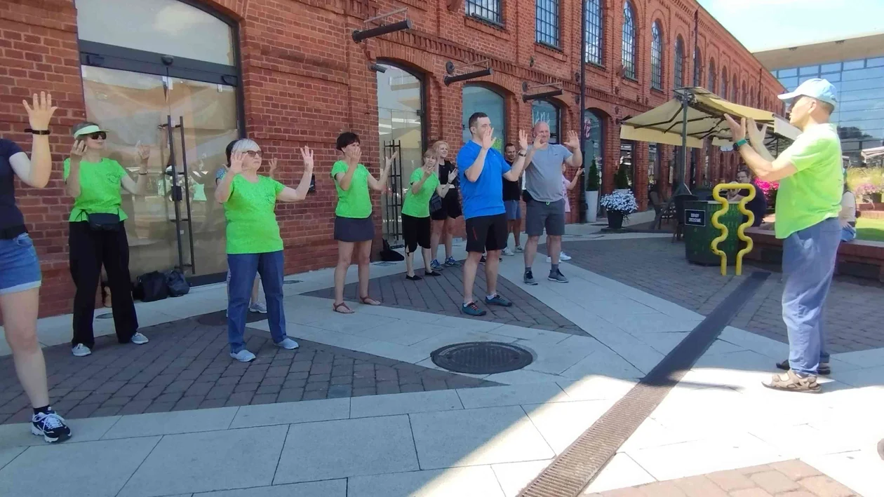 Tak było również w sobotę, 8 lipca. Według planów, spotkanie miało odbyć się na plaży, jednak z powodu palącego słońca prowadzący przeniósł je w podcienia Manufaktury. Dzięki temu ćwiczącym nie dokuczał upał.