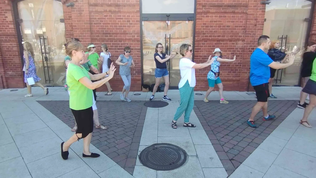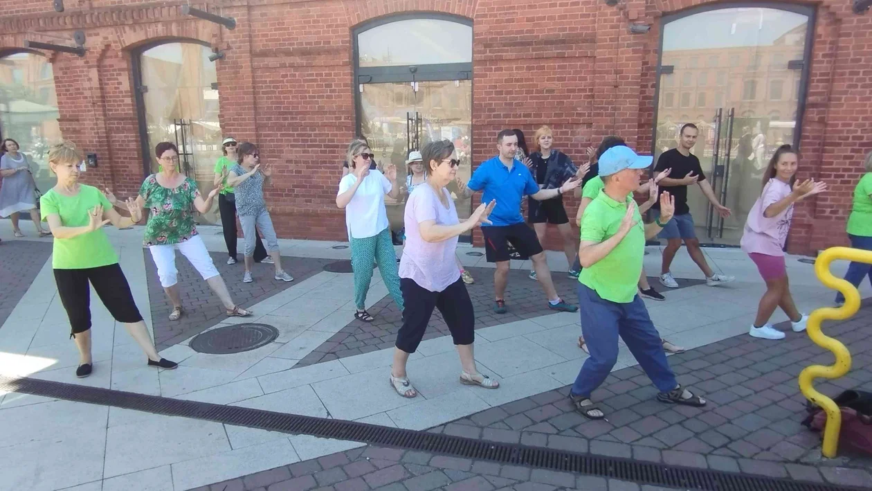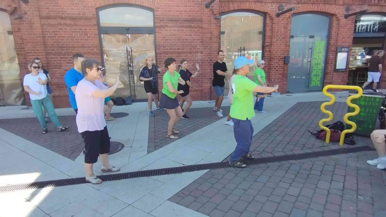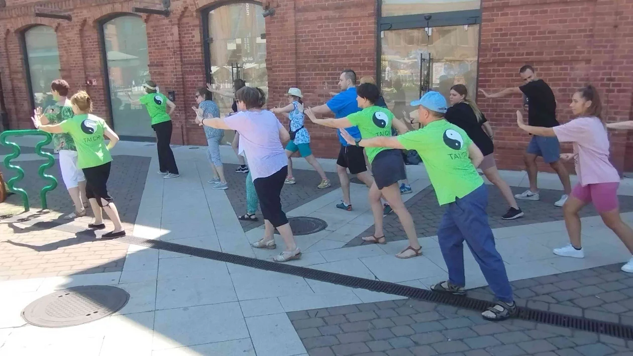 Najpierw odbyła się rozgrzewka, podczas której do ruchu przyzwyczajane były po kolei wszystkie części ciała. W grupie, która zebrała się na rynku Manufaktury, były osoby, które z tai chi miały już styczność i znały poszczególne sekwencje ćwiczeń, jak i takie, które z tą formą aktywności fizycznej spotkały się po raz pierwszy.