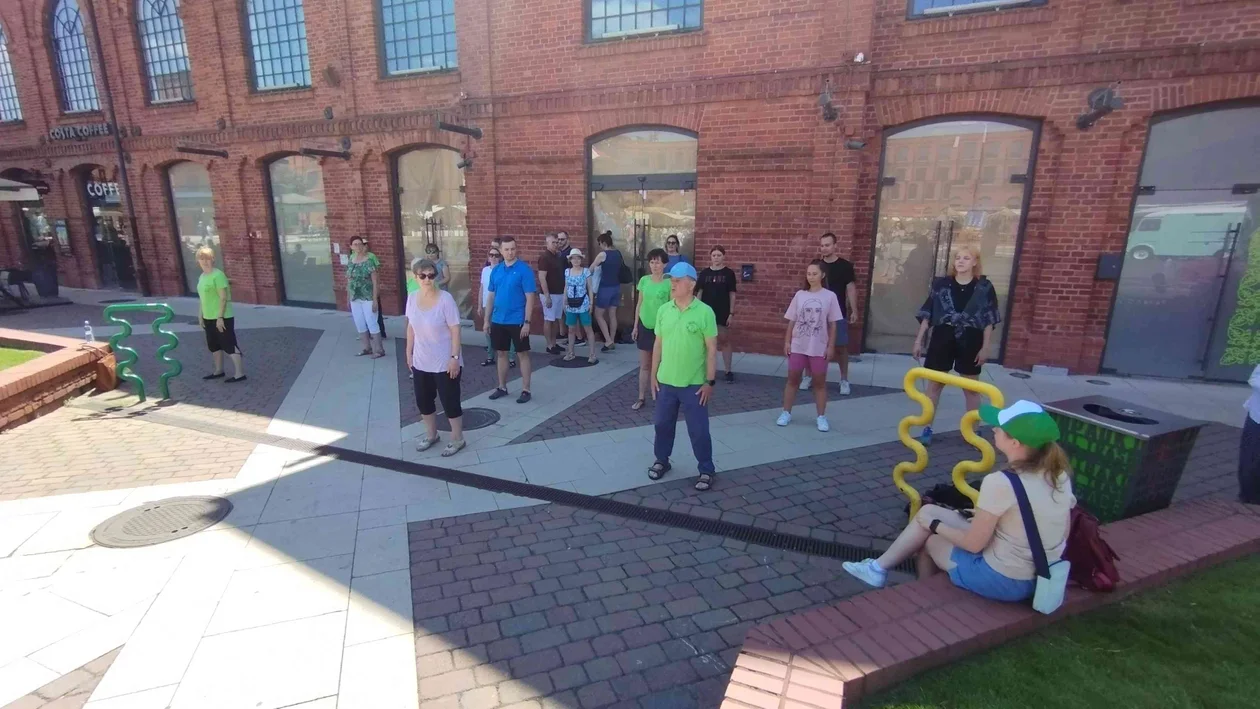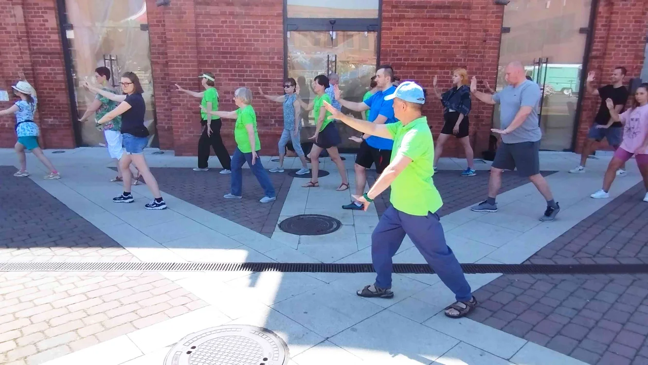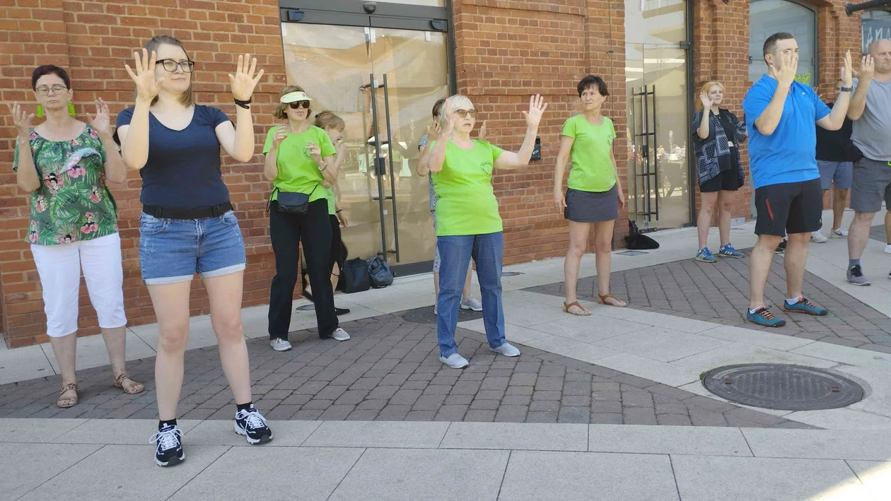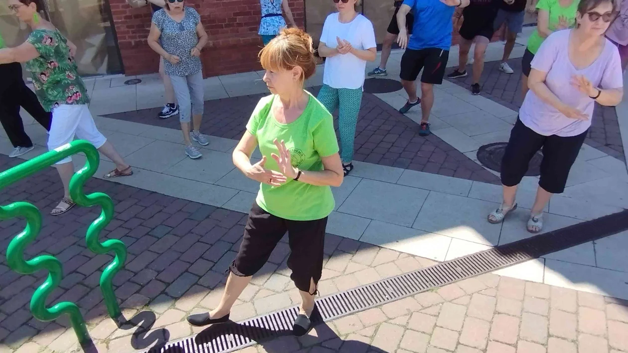 Najpierw odbyła się rozgrzewka, podczas której do ruchu przyzwyczajane były po kolei wszystkie części ciała. W grupie, która zebrała się na rynku Manufaktury, były osoby, które z tai chi miały już styczność i znały poszczególne sekwencje ćwiczeń, jak i takie, które z tą formą aktywności fizycznej spotkały się po raz pierwszy.