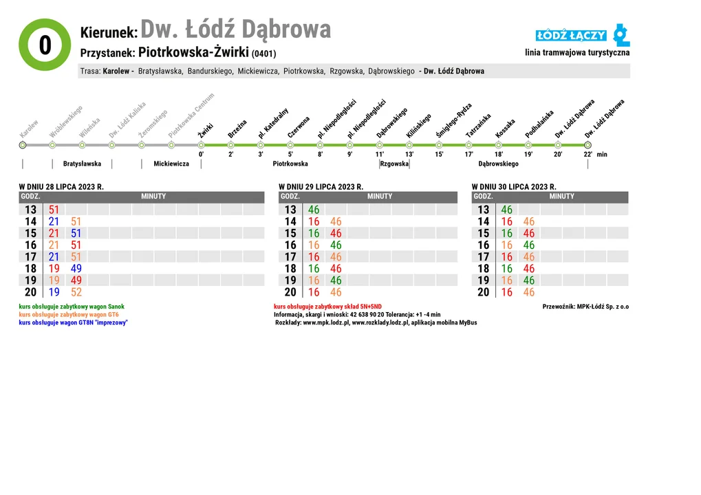 - Z początkiem lipca do autobusowej linii turystycznej, dołączą zabytkowe tramwaje, które kursować będą na linii 0 z placu Niepodległości przez Piotrkowska Centrum i dworzec Łódź Fabryczna do Radiostacji. Na tramwajowej linii turystycznej spotkamy wagon typu Sanok z lat 20. Skład czerwonych wagonów typu 5N z lat 60 oraz wagony 803N „Kanciak” i GT6 znane z podmiejskich linii do Pabianic czy Zgierza.